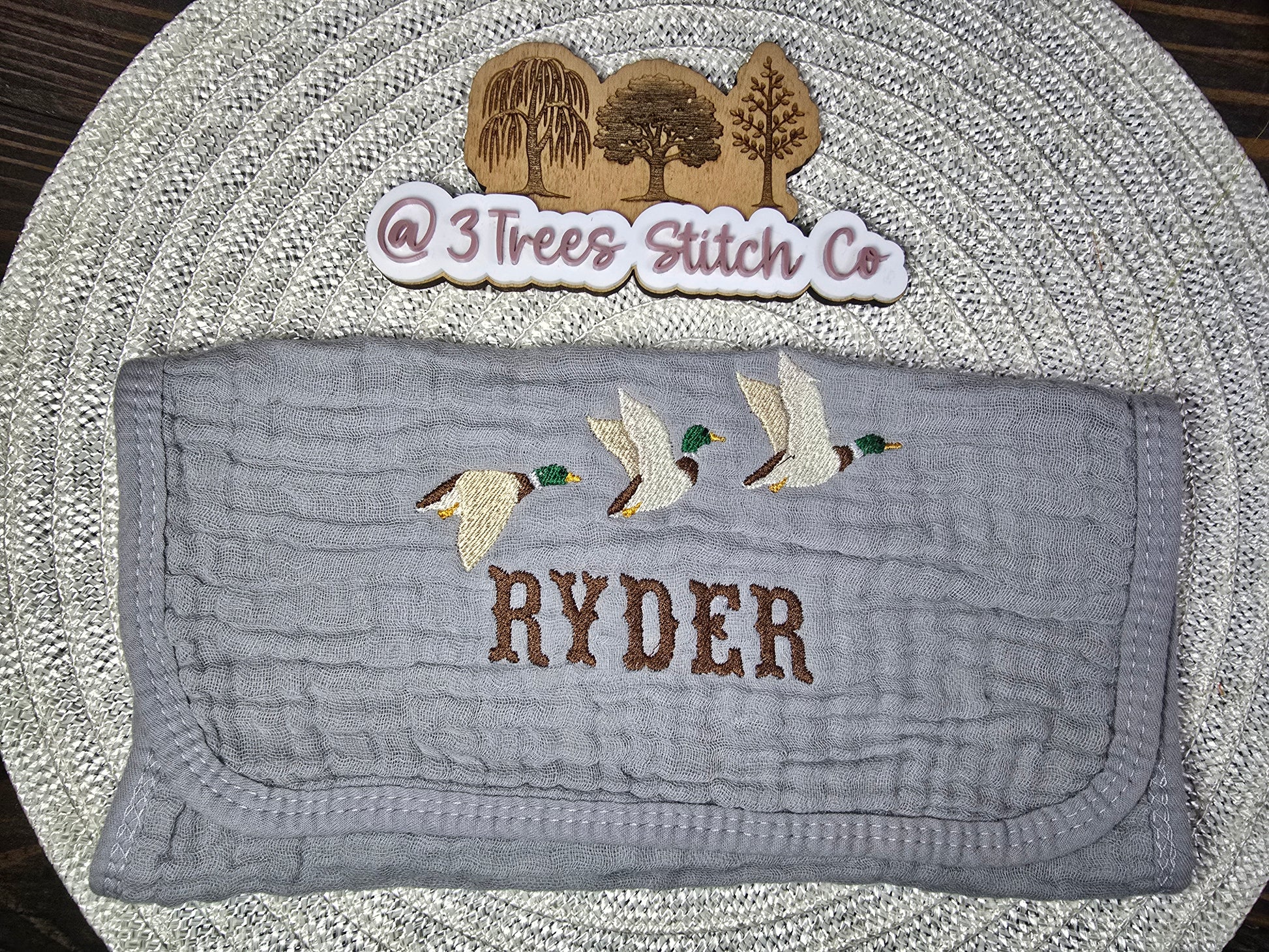 🦆 Muslin Burp Cloth with Embroidered Flying Duck Trio